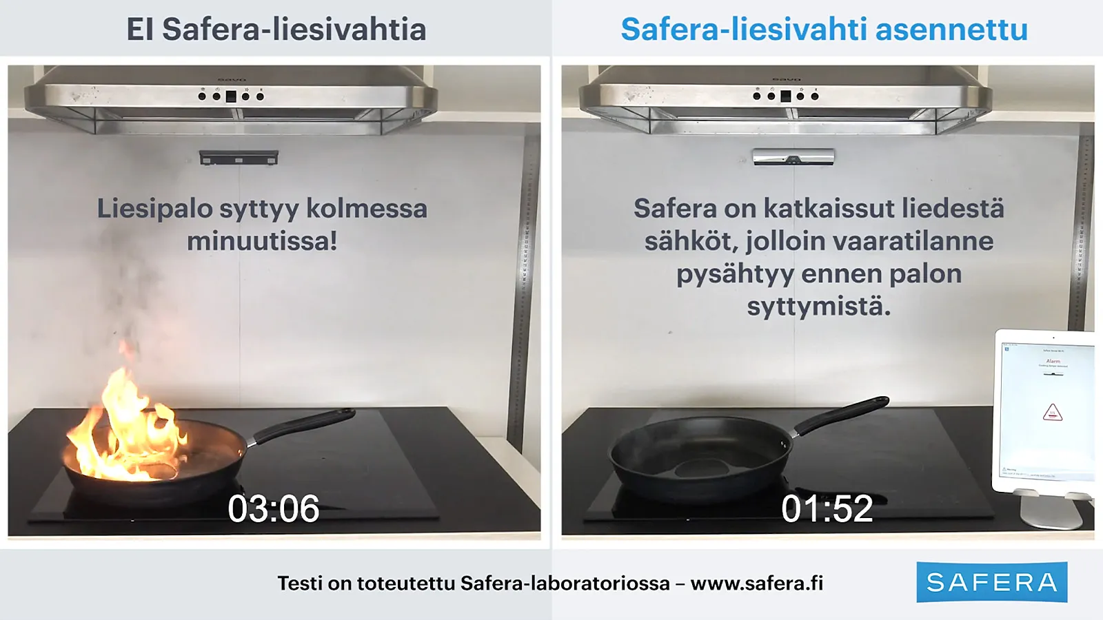 Katso oheisesta videosta, miten käy jos liesi unohtuu päälle eikä kukaan ole vahtimassa - ja miten Safera-liesivahti hoitaa tilanteen tarvittaessa puolestasi.