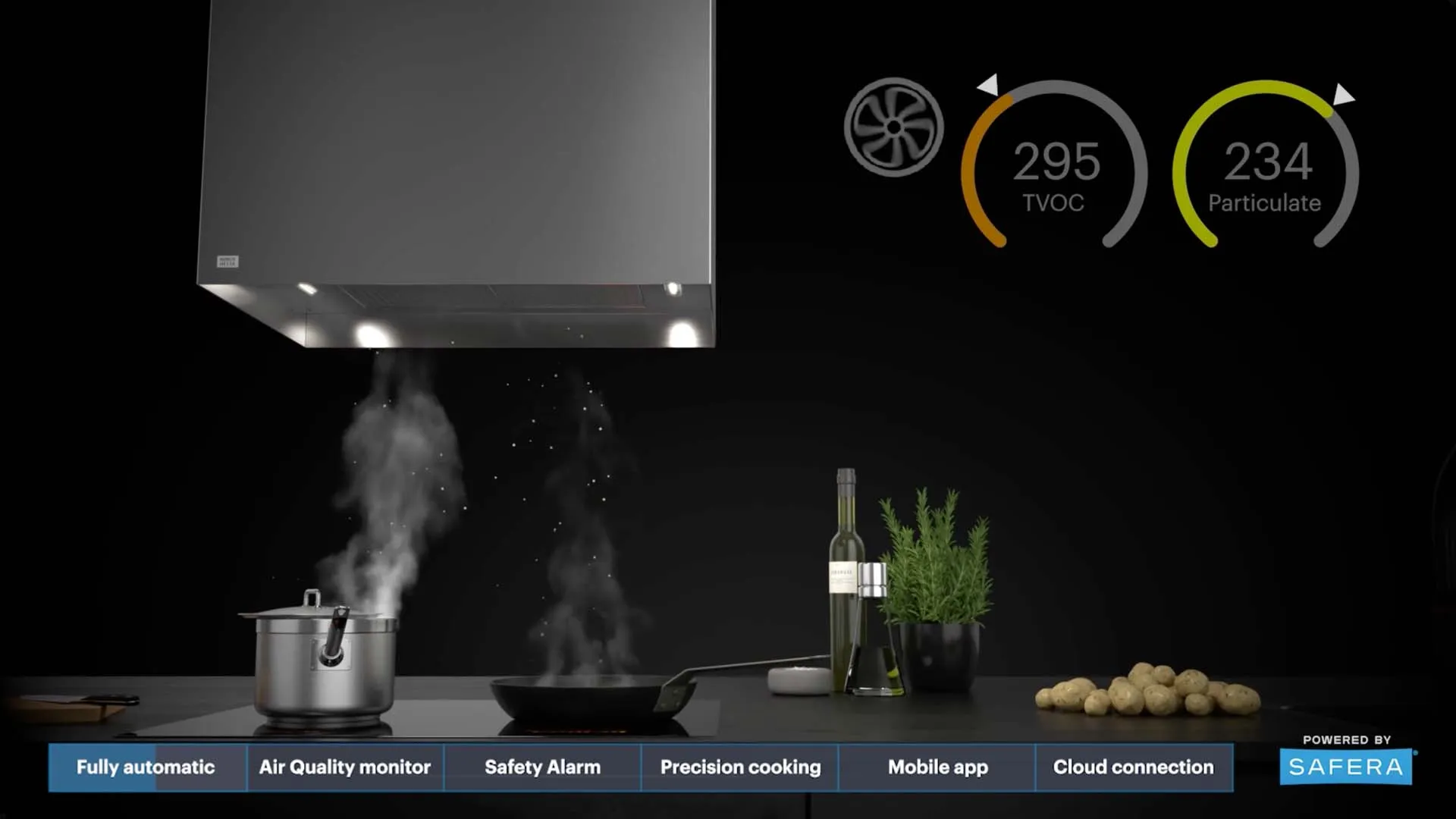 Safera Sense Integral pitää sisäilman raikkaana ja terveellisenä: se ohjaa liesikuvun tuuletinta keittotason käytön perusteella ja valvoo reaaliaikaisesti ilmanlaatua patentoiduilla antureillamme, joilla mitataan seuraavia:
