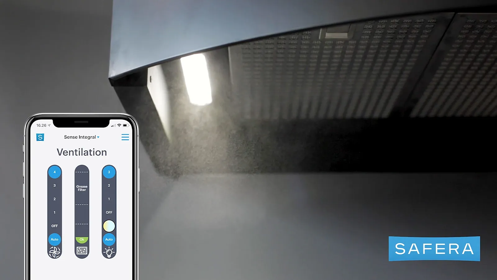 Safera Sense Integral ohjaa liesituuletinta täysin automaattisesti. Voit kuitenkin halutessasi käyttää sen tuuletintoimintoa ja valaistusta myös manuaalisesti liesituulettimen perinteisen fyysisen käyttöliittymän tai interaktiivisen Safera-mobiilisovelluksen avulla.