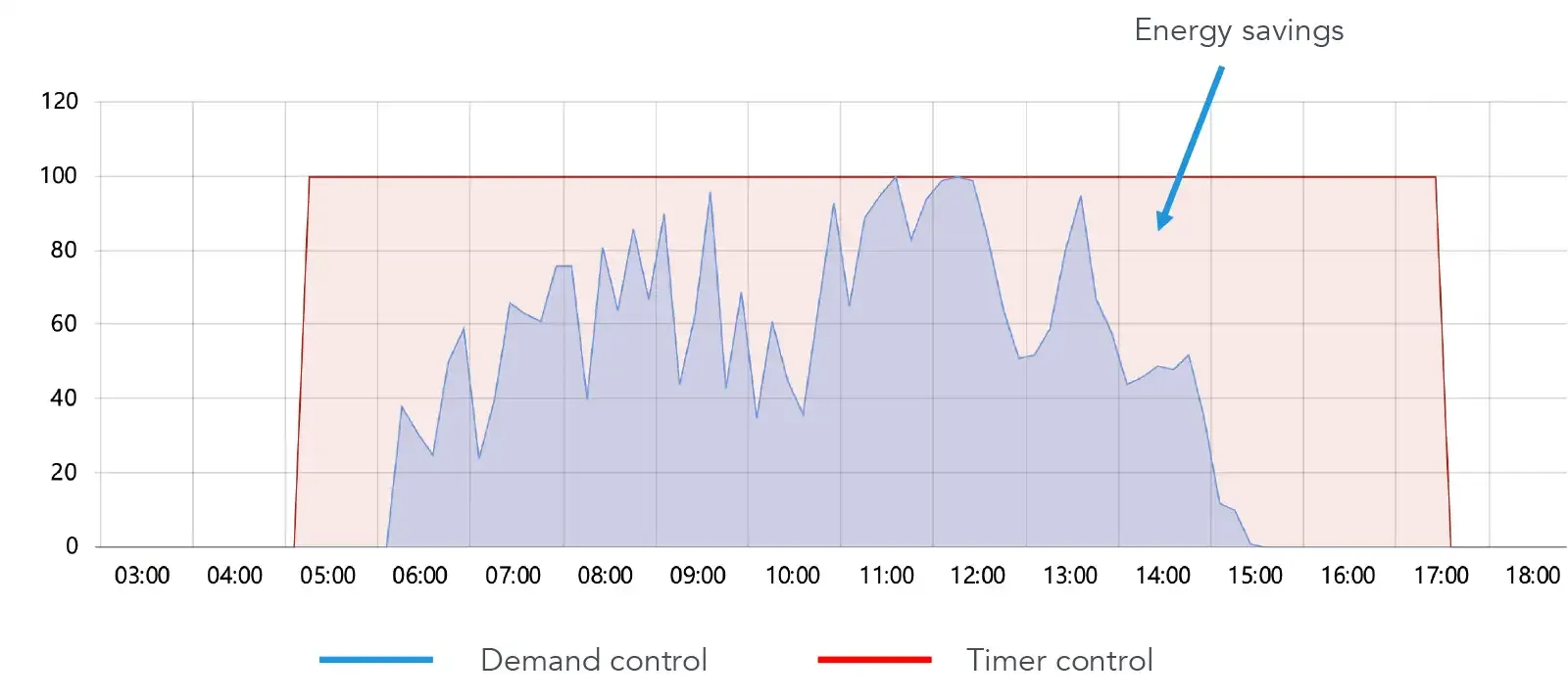 Energy use can be compared directly to the previous timer-based operation, and verified savings can be documented through automatic reports.
