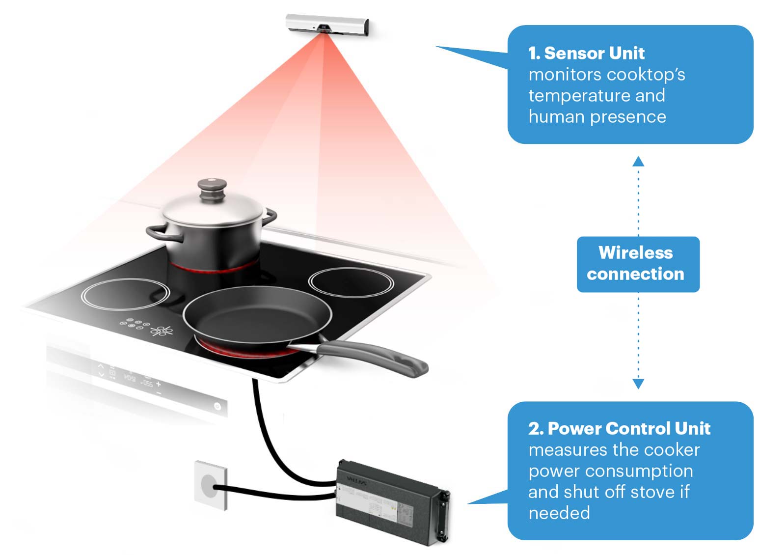 Safera Sense can be installed in your own, familiar stove. The stove guard comes with two parts: the sensor unit, which monitors the status of the stove, and the power control unit, which controls the supply of power to the stove. The units communicate with each other wirelessly.